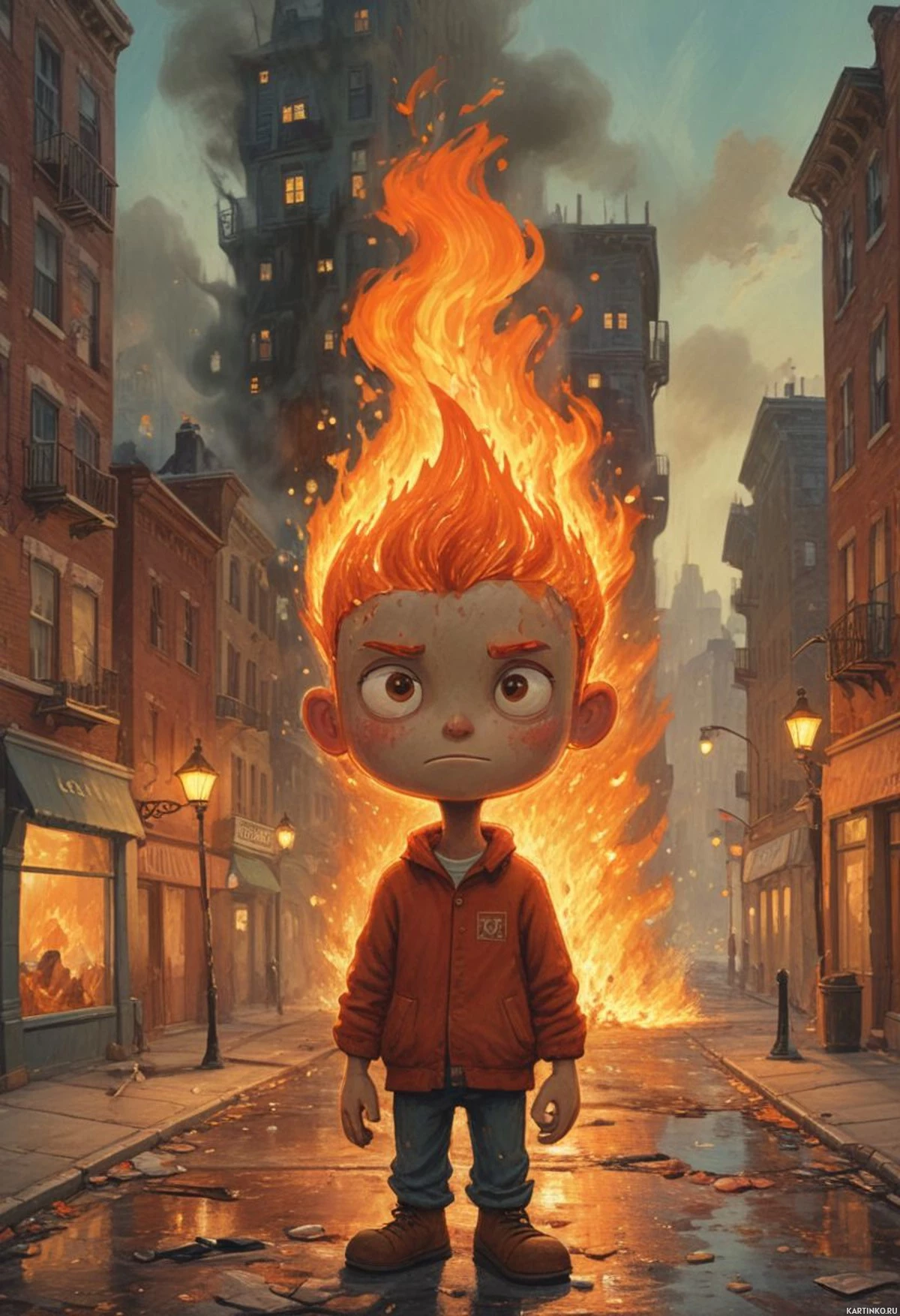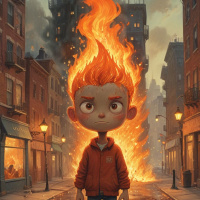 an orange jacket and appears to be looking off to his left with a concerned or curious expression. Flames are visible above the boy's head, suggesting that he might have some control over fire or that it could be