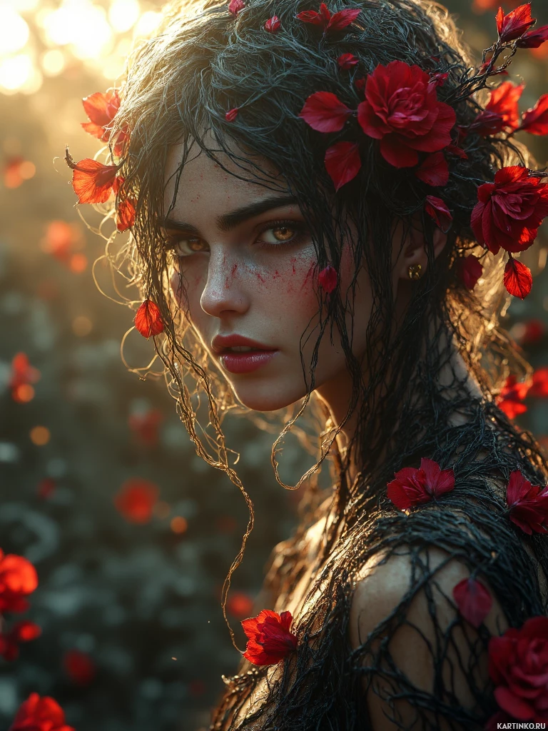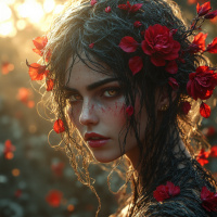 The image features a woman with an ethereal and fantastical appearance. She has red roses that seem to be part of her hair or headpiece, and there are more