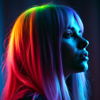 The image features a person with short hair, showcasing a gradient of multiple colors that transition from one side of the head to the other. The individual has their head tilted downward and is looking off to the side, away from the camera. They are wearing what appears to be a dark top or jacket. The background has a blurred effect with hints of blue and black, suggesting an indoor setting with artificial lighting that casts a soft glow on the person's head.