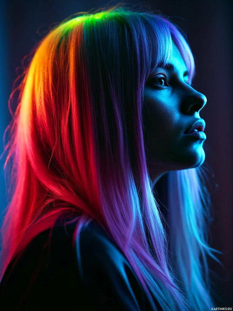На картинке изображен человек с короткой стрижкой, демонстрирующий градиент множества цветов, плавно переходящих с одной стороны головы на другую. Голова наклонена вниз, и человек смотрит в сторону, не в камеру. На нем, похоже, темная кофта или куртка. Фон размыт, с оттенками синего и черного, что указывает на помещение с искусственным освещением, мягко подсвечивающим голову человека.