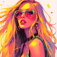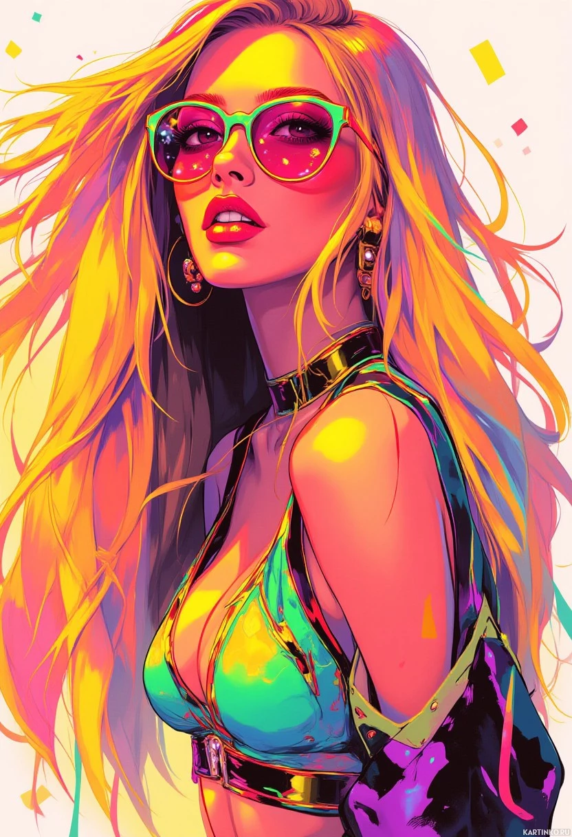 hoop earrings and multiple bracelets on her left wrist. The background suggests a bright, neon-lit environment with abstract shapes and
