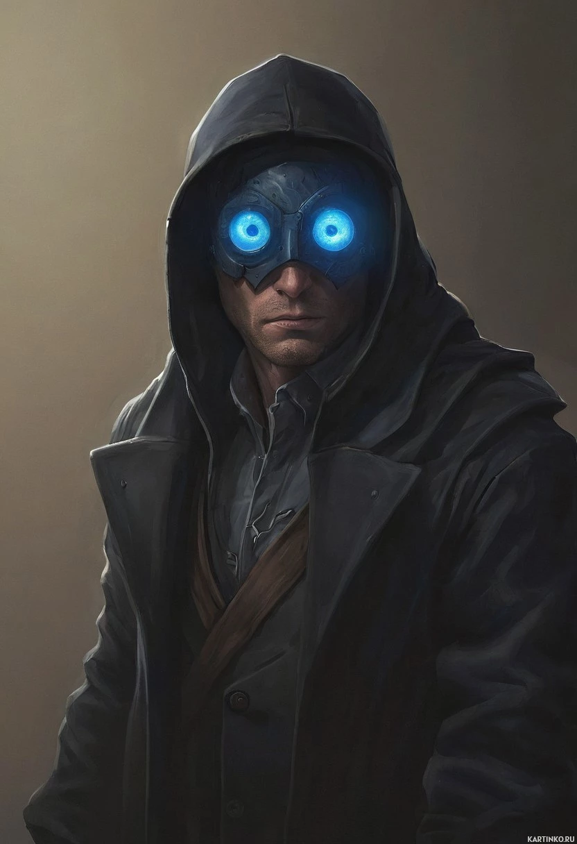 На картинке изображен мужчина в темном плаще с поднятым капюшоном и маской, полностью закрывающей голову. У него напряженное выражение лица, намекающее на серьезность или интенсивность. На плечах видны ремни, возможно, указывающие на какой-то инструмент или оружие. Фон нейтральных тонов создает контраст с темными оттенками его одежды.