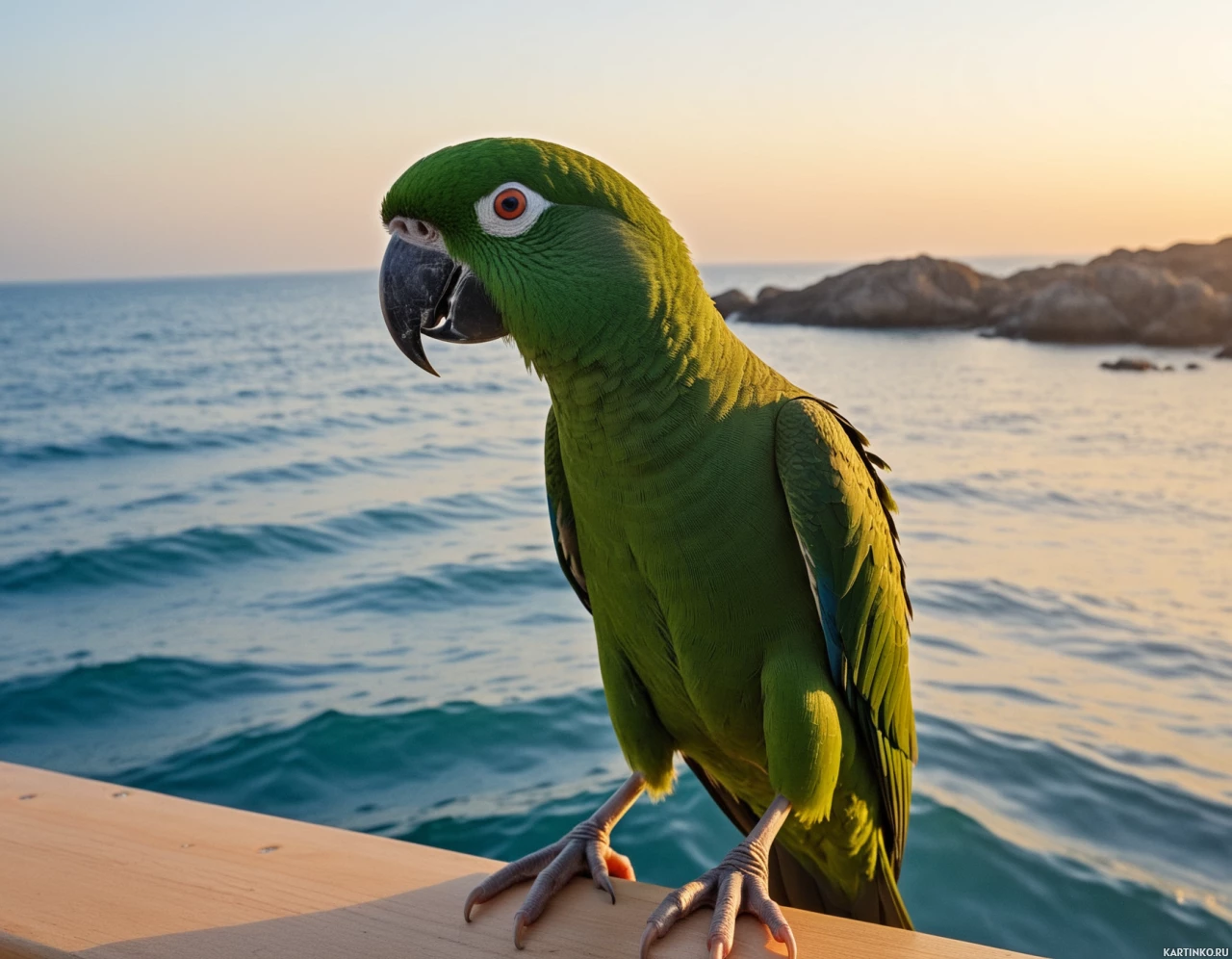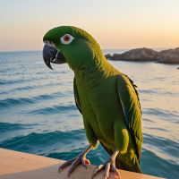 warm hues near the horizon to cooler tones higher up, indicating either sunrise or sunset. The overall atmosphere of the image is serene and peaceful, with the parrot as the main subject against a picturesque