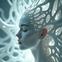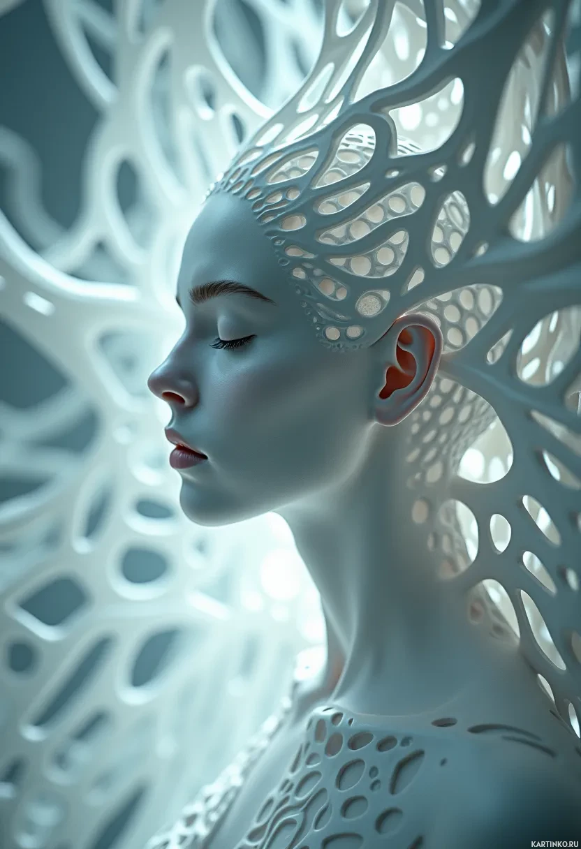 closed eyes, giving it an appearance of serenity or perhaps even a state of suspended animation. The figure has intricate details and a transparent quality that suggests the presence of delicate structures within its body, possibly representing muscles, bones, or other