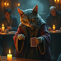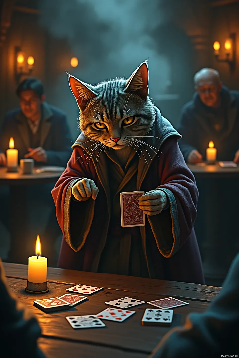 a whimsical scene where a cat is dressed in what appears to be a Jedi costume, complete with a robe and holding a hand of playing cards. The cat stands at a table with several other characters that seem to be humans. The setting has the atmosphere of a tavern or pub, characterized by