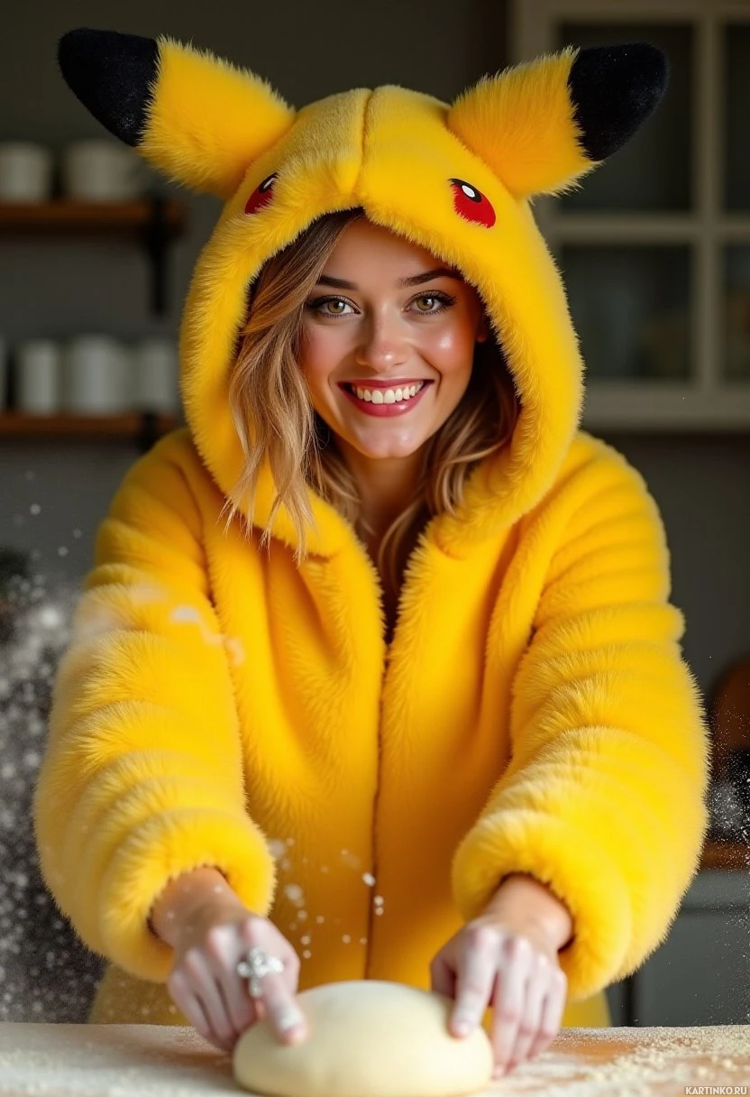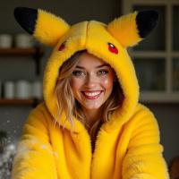 blonde hair and is wearing a yellow hooded onesie with a Pikachu hood. The woman appears to be in a kitchen, as suggested by