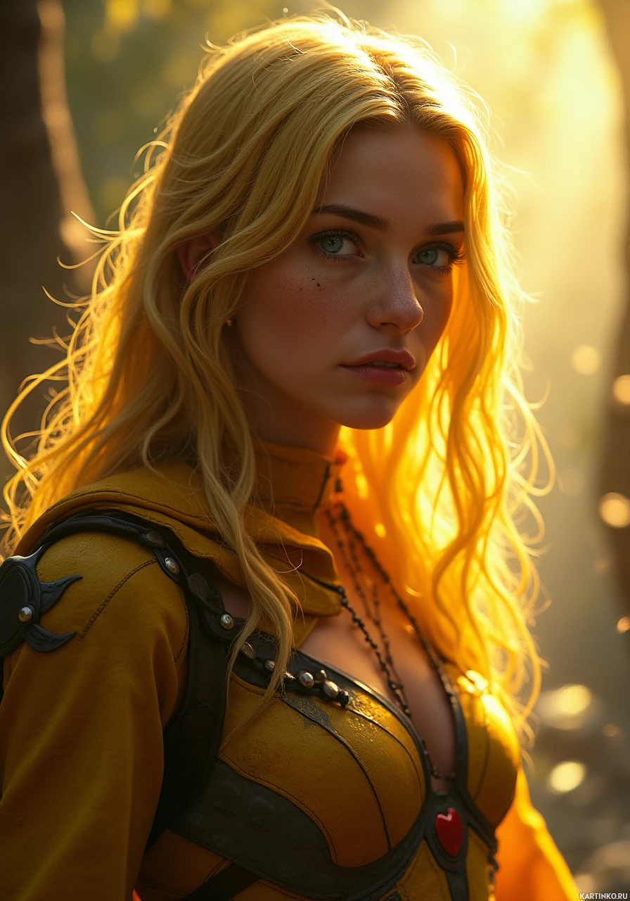 На картинке запечатлена молодая женщина с золотистыми волосами и выразительными голубыми глазами, она задумчиво смотрит вдаль. У неё светлая кожа, и её черты лица выделяются веснушками на щеках. Выражение её лица серьёзное и сосредоточенное. На ней наряд в средневековом стиле, жёлтого цвета, украшенный кожаными ремнями и пряжками, что придаёт ей образ сильной и отважной. Вокруг – лесная местность на закате, что видно по приглушённому освещению и сумеречному небу на заднем плане.