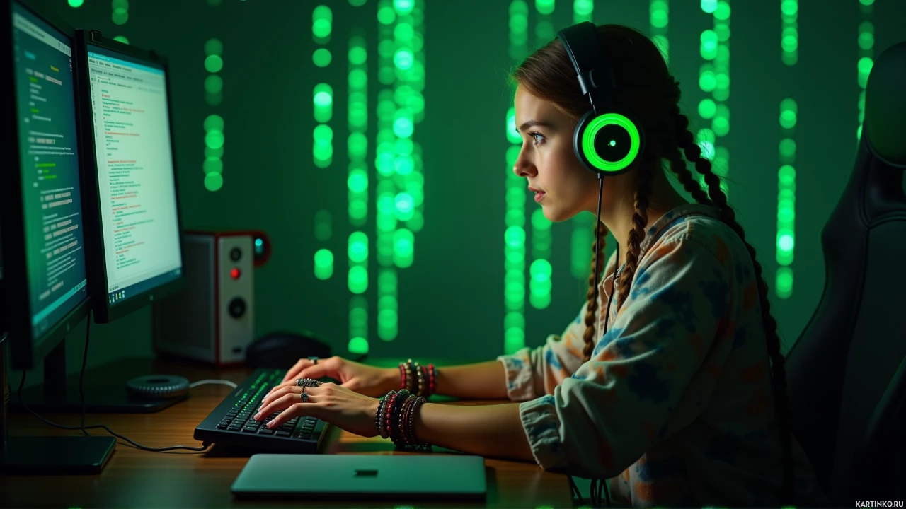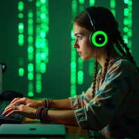 a young woman sitting at a desk with a computer setup. She is wearing headphones, suggesting she might be listening to music or engaging in an audio-based activity such as gaming or video chatting. In front of her on the desk are two monitors displaying what appears to be lines of text, likely code, indicating that she could be working on a programming task. There's also a keyboard and a mouse visible. The background has