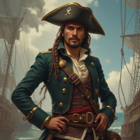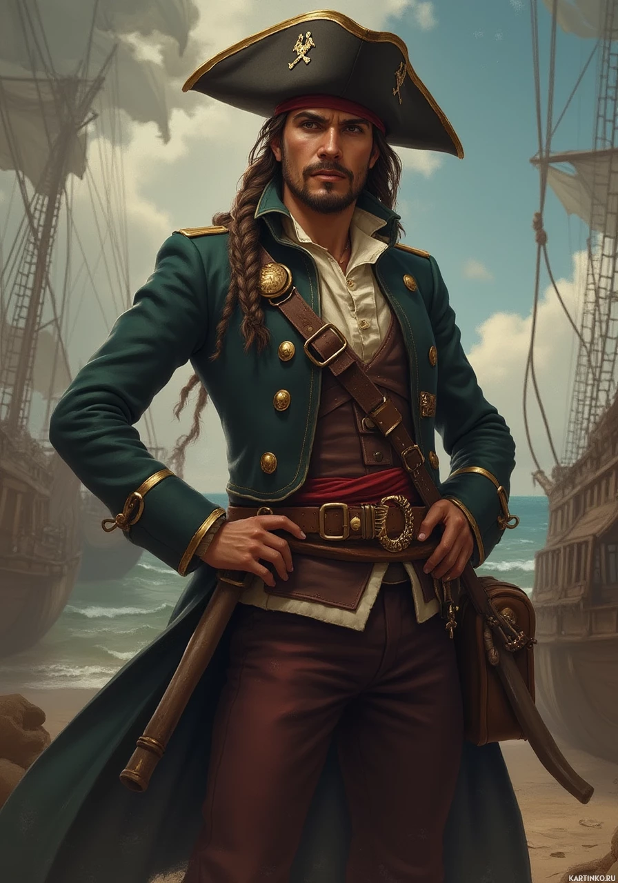 brimmed hat, likely associated with the style of a pirate from historical or fictional representations. His attire includes a coat with