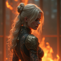 На картинке изображен персонаж из видеоигры, стоящий на фоне бушующего пламени. У неё белые волосы, и глаза закрыты. Она одета в тёмную броню или костюм, украшенный сложной вышивкой, что говорит о том, что она, вероятно, воин или боец. Её осанка прямая, одна рука покоится на бедре, что говорит о уверенности. Освещение подчеркивает текстуру и дизайн брони, контрастируя с ярким огнём позади неё.