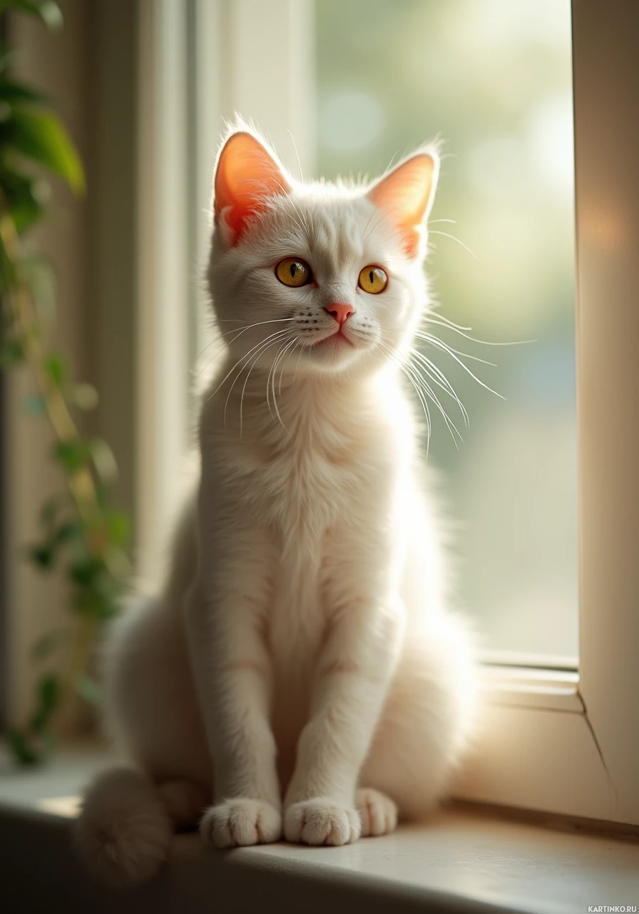 На картинке сидит маленький котенок с шерсткой желто-белых оттенков. Он смотрит вправо, слегка приоткрыв рот, словно с любопытством наблюдает за чем-то. На заднем плане по обе стороны от окна видны два растения. Солнечный свет, льющийся из окна, освещает шерстку котенка и подчеркивает его глаза и нос.