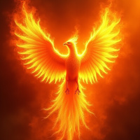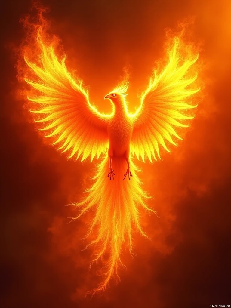 На картинке изображён феникс с огненно-оранжевыми и жёлтыми перьями и красными глазами, стоящий на облаке на фоне тёмного пейзажа, напоминающего либо бурю, либо вулканический ландшафт. Птица смотрит влево, словно в полёте или с широко расправленными крыльями.