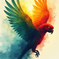 The image features a vibrant and colorful parrot. It's depicted with its wings spread wide, as if it is either in flight or displaying its full size. The background has