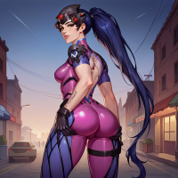 the video game Overwatch. This character is known for her role as Widowmaker, and she is depicted in her recognizable outfit which includes a skirt, gloves, and hair adorned with what appears to be a visor or headgear. Her attire suggests she might be playing the game. In the background, there's an urban