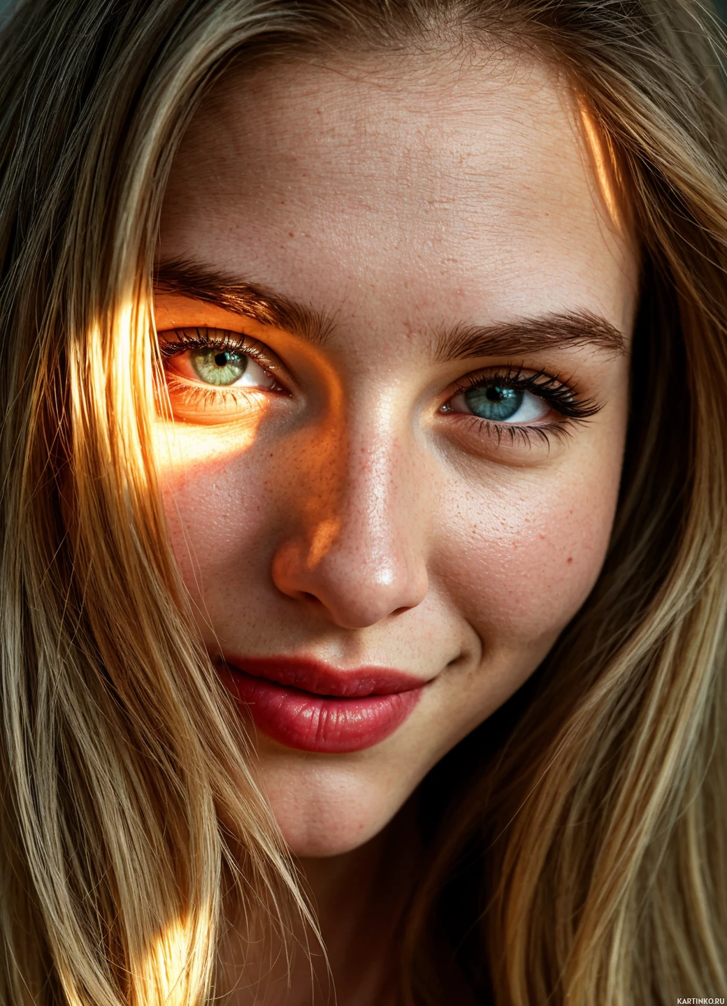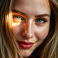 a warm glow on her skin and highlighting her features. The background is not clearly visible but seems to be
