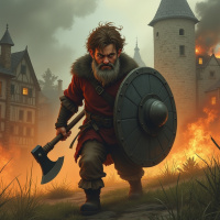 The image depicts a fantasy scene featuring a man who appears to be a warrior from a bygone era. He is prominently positioned in the center of the image, with a stern expression on his face as he holds a large axe in one hand and a round shield in the other. His attire includes furs that suggest cold weather conditions. Behind him, a town is depicted with buildings engulfed in flames, indicating conflict or warfare. The sky above is dramatic with dark clouds and hints of lightning, adding to the intensity of the scene.