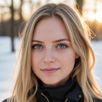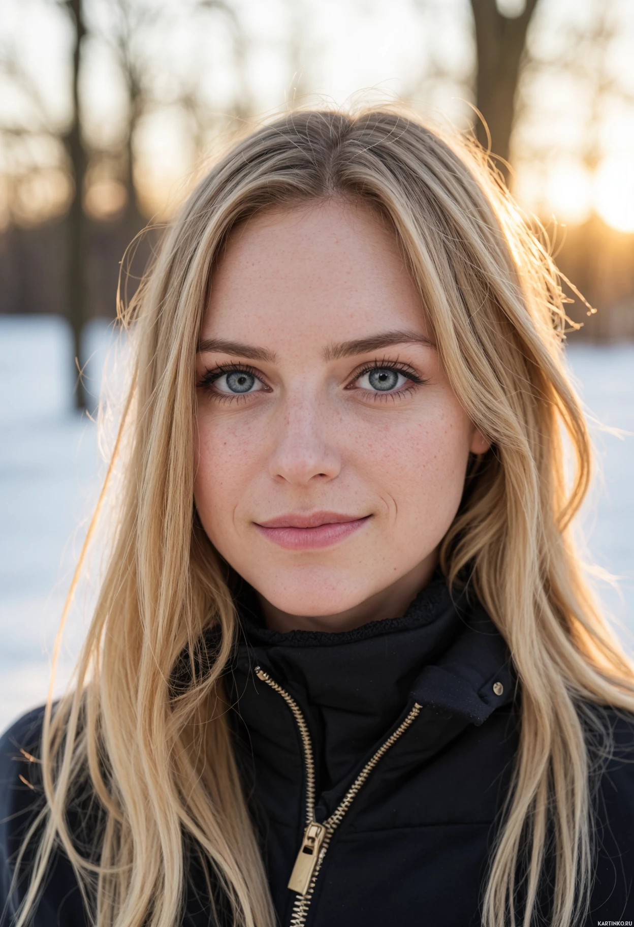 На картинке изображена женщина с светлыми волосами, смотрящая прямо в камеру с мягкой улыбкой. У нее светлая кожа, широко раскрытые глаза с голубыми радужками, четко очерченные брови и юный вид. На ней темная пуховая куртка, что говорит о холодной погоде или зиме. Фон размыт, но видно, что это открытое пространство с теплыми тонами, возможно, рассвет или закат.