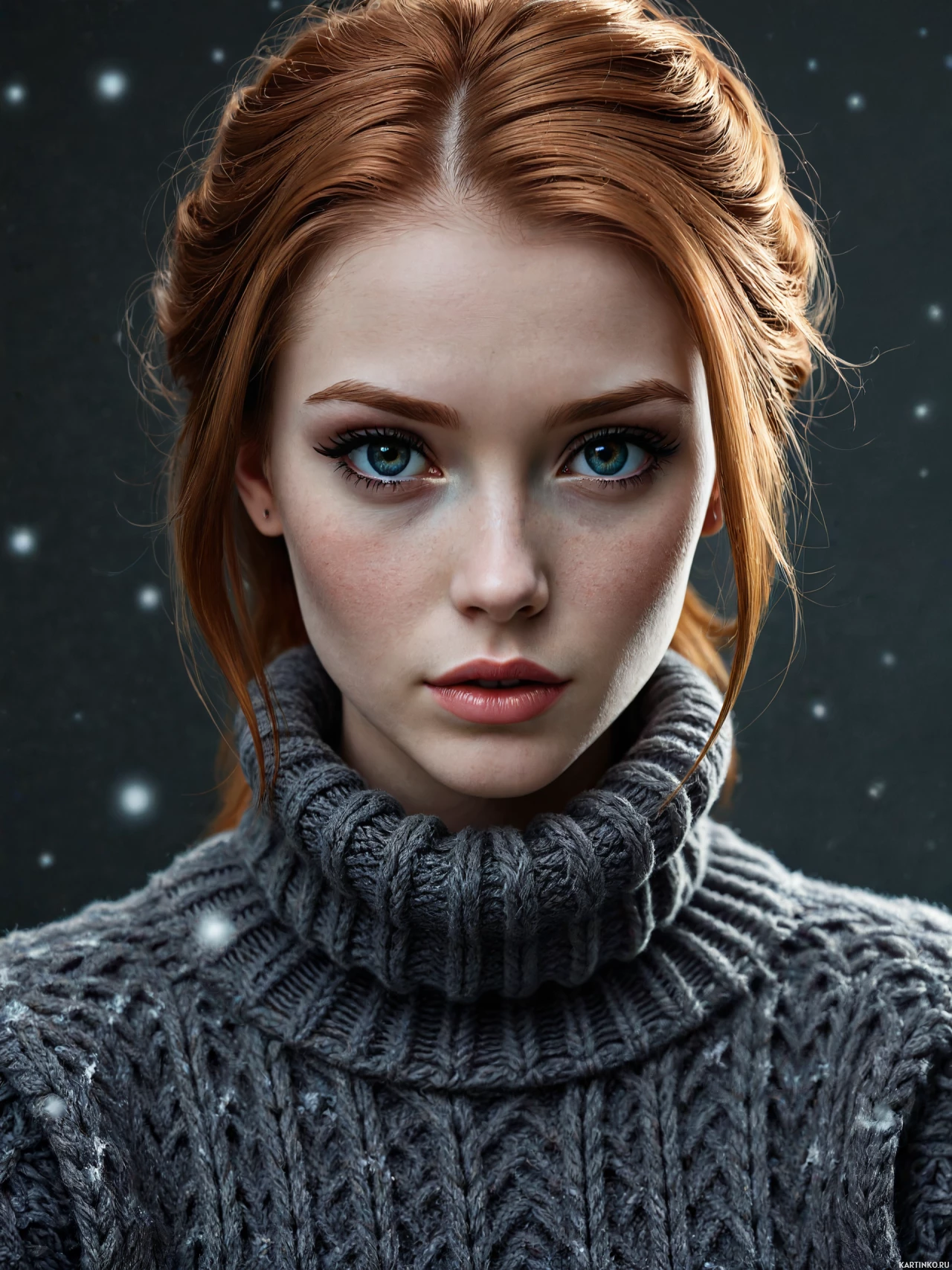 На картинке запечатлена молодая женщина со светлой кожей и рыжими волосами, собранными в высокую причёску. Её взгляд немного отвёрт от камеры, что позволяет рассмотреть её в профиль. На лице макияж, включая чётко очерченные брови и тени, подчёркивающие голубой цвет глаз. Губы деликатно подкрашены в тон кожи. На ней тёмный вязаный свитер с высоким воротом. Вокруг краев картинки разбросаны блёстки или искры, возможно, создающие ощущение звёздной ночи или космическую тематику. Общий стиль картинки напоминает цифровую графику или профессиональный портрет, подвергнутый художественной обработке.