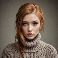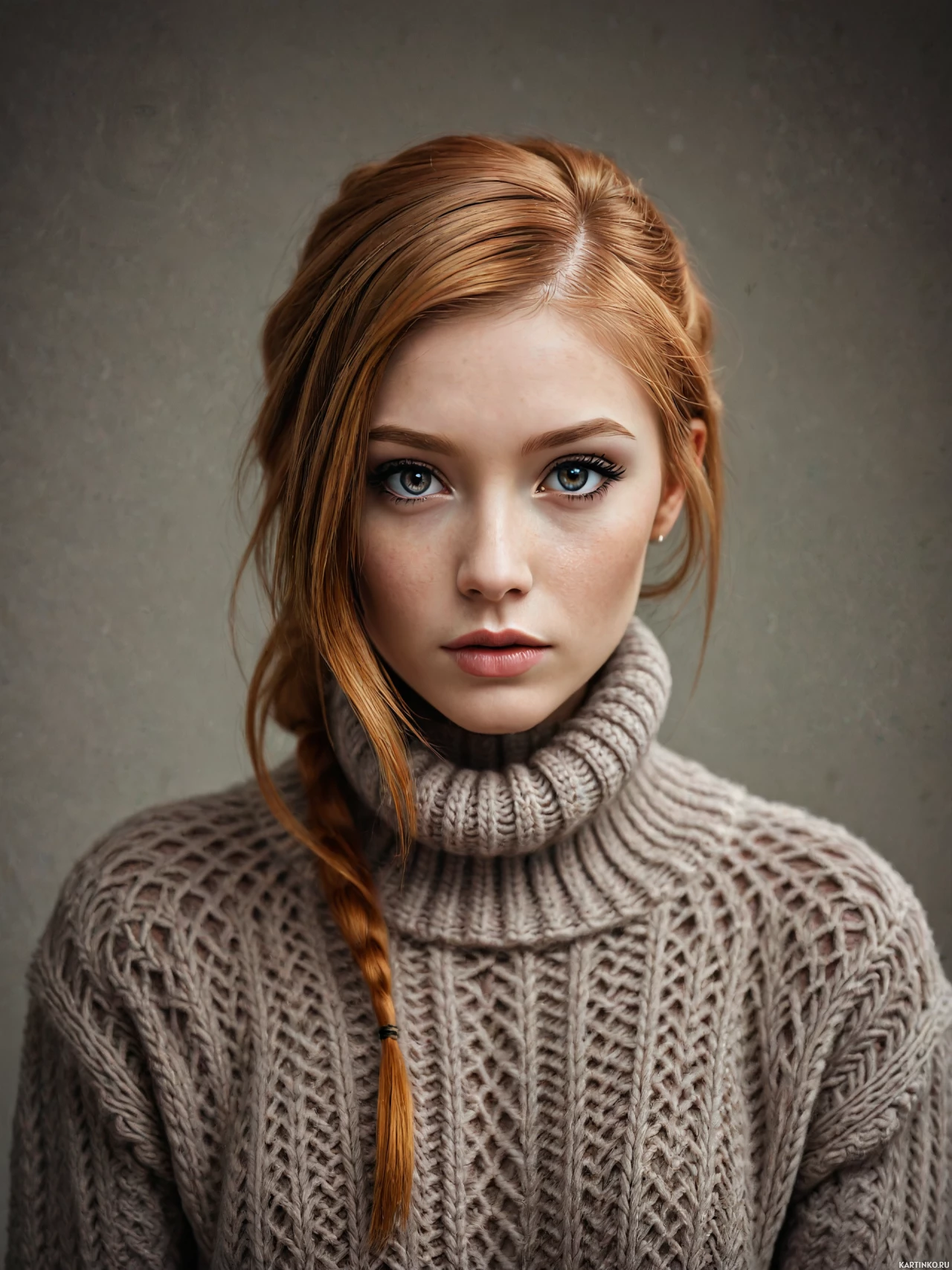 Картинка показывает крупный план портрета молодой женщины с рыжими волосами, зачесанными набок и убранными назад, обнажая уши. У нее поразительные голубые глаза, смотрящие прямо в камеру. Черты лица мягкие, на лице – нейтральное выражение. На ней макияж, включая подводку для глаз и, похоже, помаду или блеск, цвет которых сочетается с цветом ее волос. Цвет ее лица светлый, кожа выглядит здоровой. Освещение на лице мягкое и ровное, что указывает на помещение с профессиональным освещением. Фон картинки размыт, акцентируя внимание на модели, но создает ощущение интерьера с теплыми тонами – возможно, комнаты с обоями или стенами с похожей текстурой. Стиль фотографии – формальный портрет, вероятно, для промо- или редакционного использования, учитывая профессиональное качество и композицию.