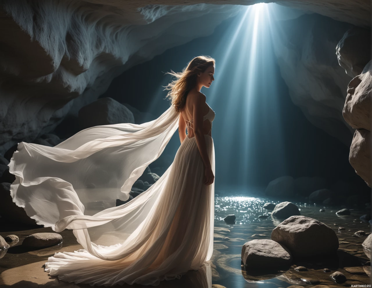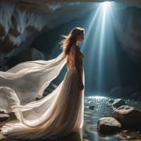 На картинке изображена фигура в длинном платье, стоящая внутри пещеры. Платье развевается, создавая ощущение движения. Человек смотрит вдаль, возможно, на солнечный свет, пробивающийся через проем в скале. Съемка ведется сверху, акцентируя силуэт фигуры на фоне полумрака пещеры и яркого света, льющегося снаружи.
