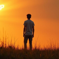 cumulus clouds that dominate the upper portion of the photo, with colors ranging from yellow to orange near the horizon. The man's posture suggests he might be deep in thought or enjoying
