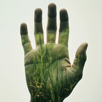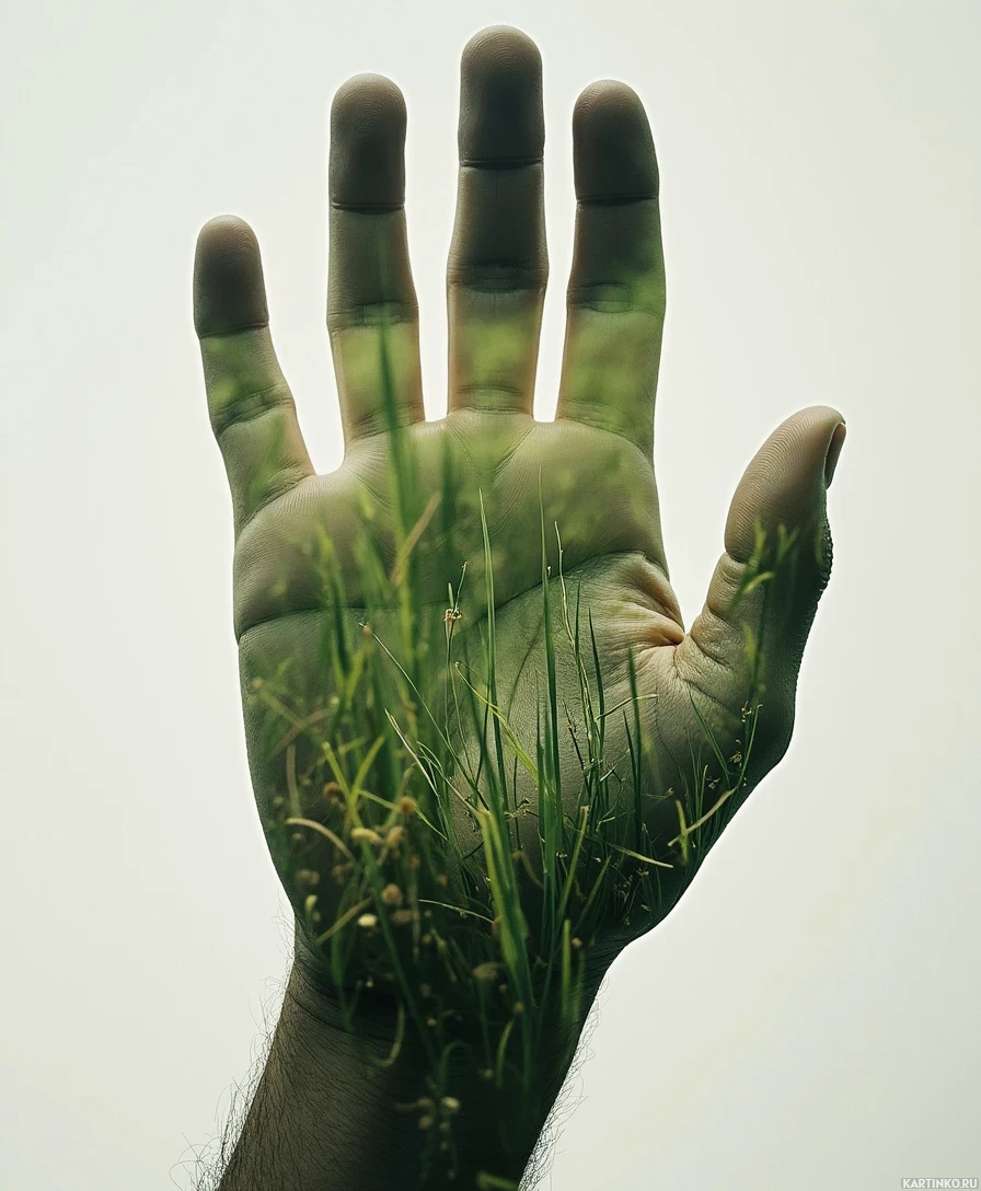 The image shows a hand emerging from the grass with palm facing upwards. The fingers are slightly curled as if reaching out or holding something. There is a hint of green coloration on the hand, which suggests it may be covered in moss or algae, indicating that the photo was taken outdoors and possibly in