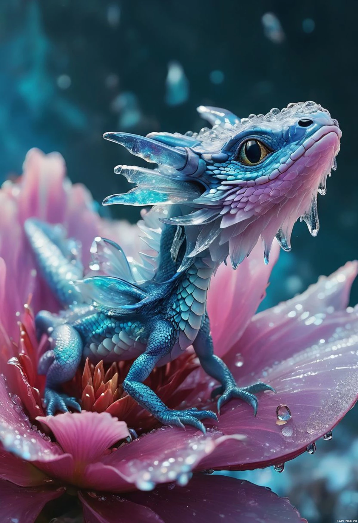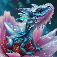 a pink flower, which appears to be in the midst of blooming. The dragon's eyes are wide open as if it is alert or curious about its surroundings. The background suggests
