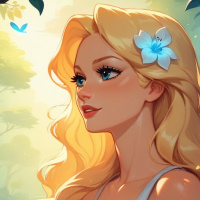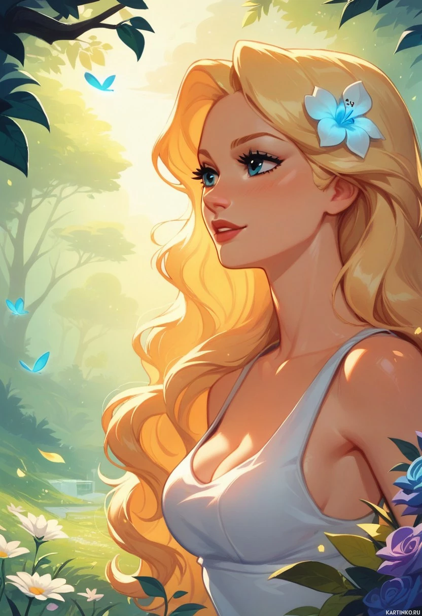 a natural environment. There are trees and foliage in the background, suggesting a forest or a garden. On the ground at her feet, there are flowers with blue petals, which add a vibrant contrast to the soft