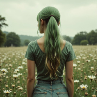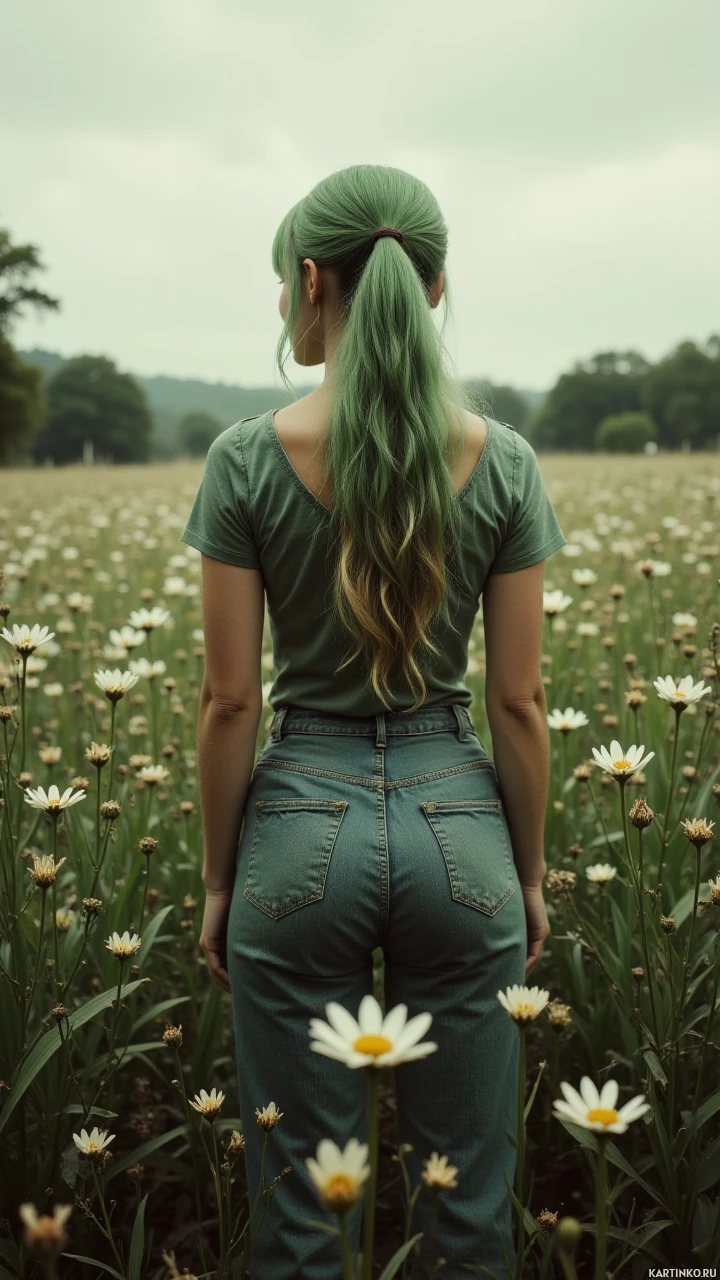 green hair and are wearing blue jeans. In front of them is a field filled with