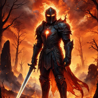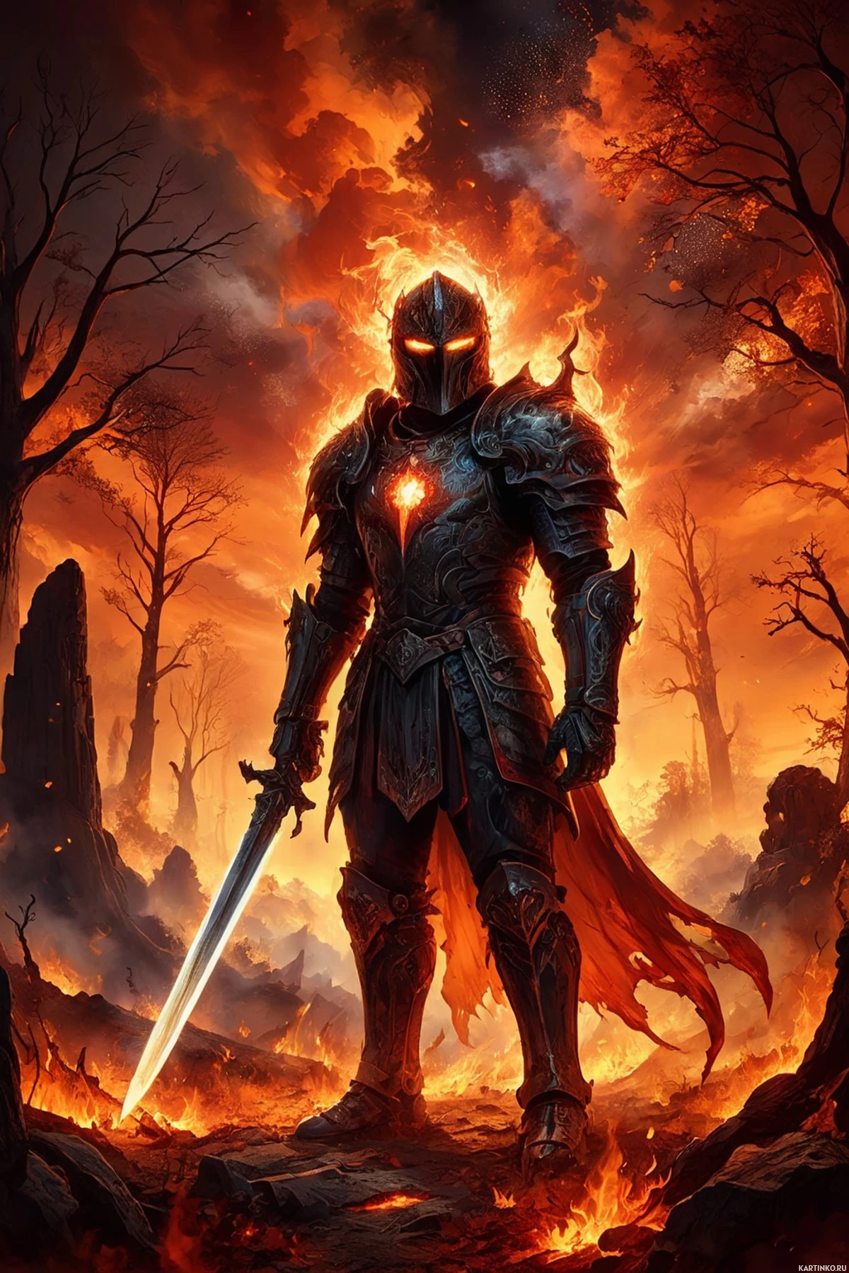 a fiery backdrop featuring flames and what appears to be an eclipse-like darkness on the left side, suggesting a sense of battle or conflict. The ground beneath the warrior's feet shows what looks like volcanic or molten rock, further enhancing