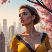 The image features a woman standing with one hand on her hip and the other resting by her side. She has short, styled hair and is wearing a yellow top with black accents and high-waisted dark jeans. Her gaze is directed away from the camera, looking to her left, which gives her a profile view. The background suggests an urban setting with trees that appear to be blooming flowers, possibly cherry blossoms, against a city skyline.