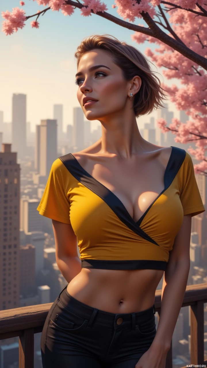 На картинке изображена женщина, стоящая с одной рукой на бедре, а другая свободно опущена. У неё короткая, уложенная прическа и она одета в жёлтый топ с чёрными деталями и джинсы с высокой талией тёмного цвета. Взгляд её направлен в сторону, влево, что создаёт эффект профиля. На заднем плане — городской пейзаж с деревьями, цветущими, возможно, вишнями, на фоне городского горизонта.