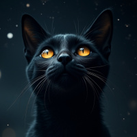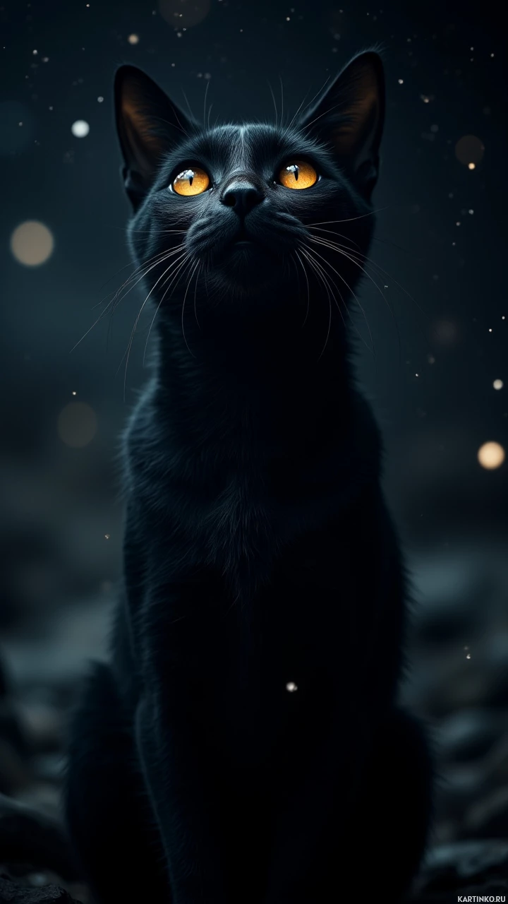 a focused gaze, with its ears perked up and eyes wide open, as if it is looking at something intently in the darkness. There are small specks that could be stars or glitter scattered around the cat, suggesting