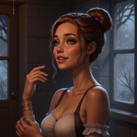 In the image, a young woman with long dark hair is seated at a wooden table. She's wearing a black crop top and has her hand on her chin in a thoughtful gesture. Her expression is serious, and she's looking directly into the camera. The setting appears to be an indoor environment with dim lighting and brick walls, giving it a casual and intimate atmosphere.