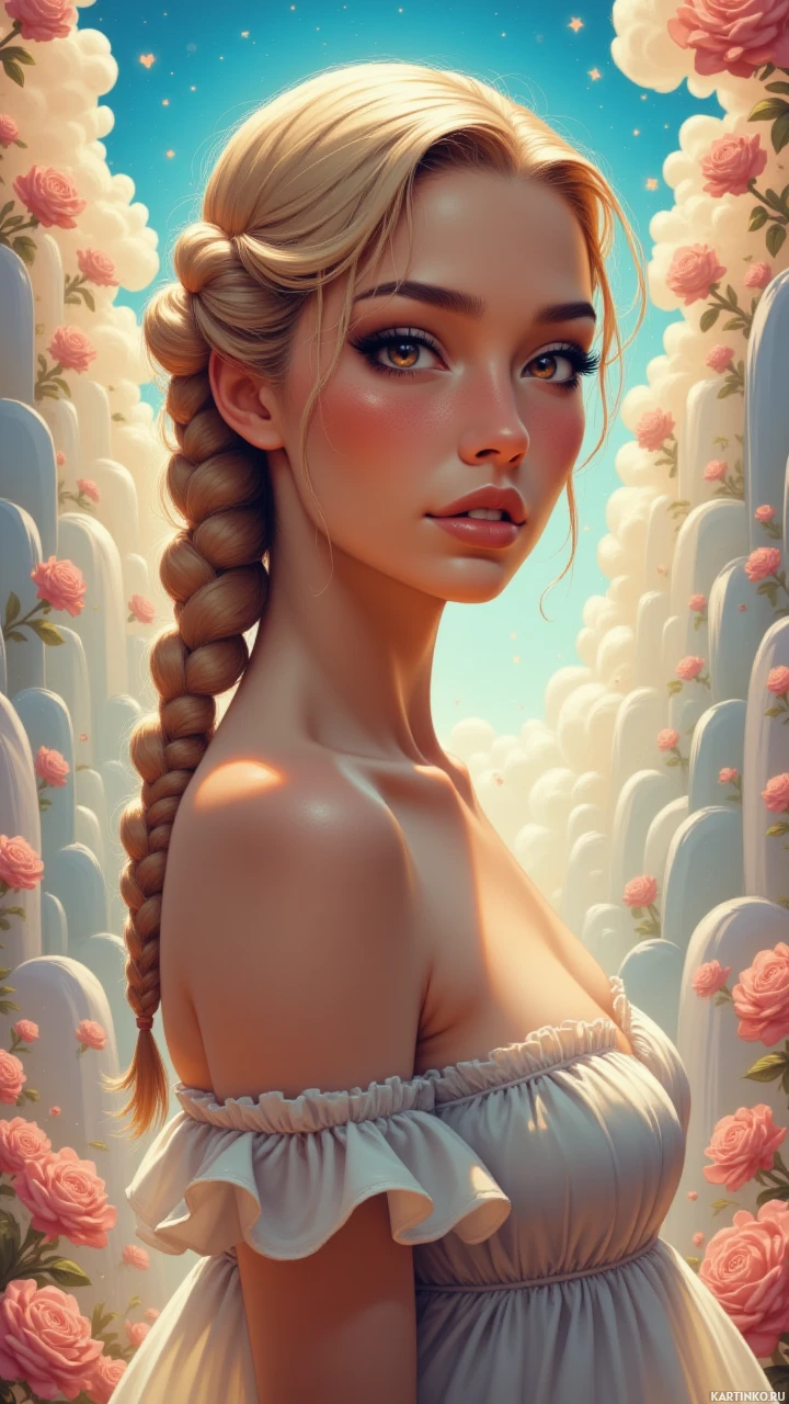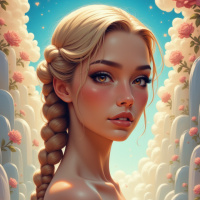 female character with blonde hair, adorned with flowers. She is wearing a light-colored top and has a soft,