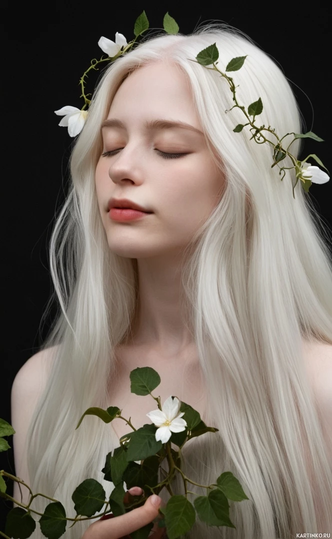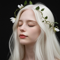 white hair that cascades around her face, creating an ethereal and dreamlike quality to the portrait. There is a delicate crown of