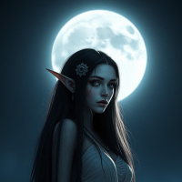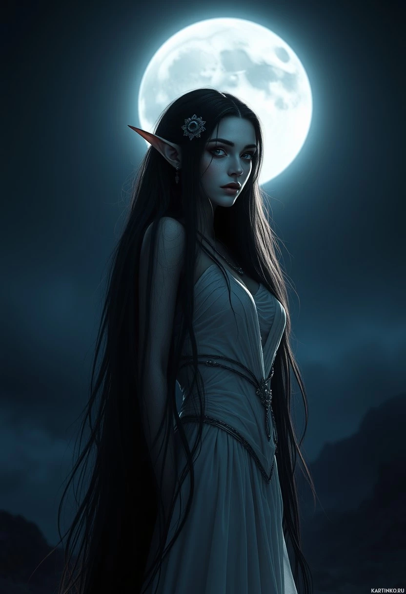 a brunette elf standing under the moon. She has long, flowing hair and is wearing an elegant