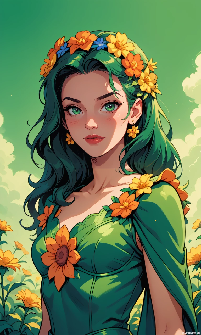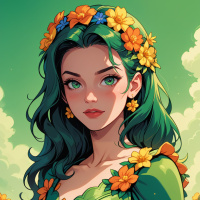 На картинке изображена молодая женщина с зелёными волосами. У неё светлая кожа, а на ней зелёный наряд, выполненный из, кажется, блестящего материала. На голове у неё венок из жёлтых цветов, который ярко контрастирует с цветом волос. На заднем плане — сочная зелёная лужайка, усыпанная множеством жёлтых цветов в полном цвету. Стиль картинки иллюстративный, и создаётся впечатление, что она сделана в цифровой графике.