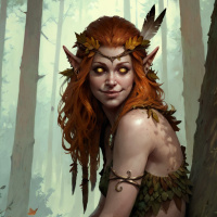 a leafy crown on her head, which suggests she might have some connection to nature or the forest. Her expression is serious as she gazes off into the distance, giving