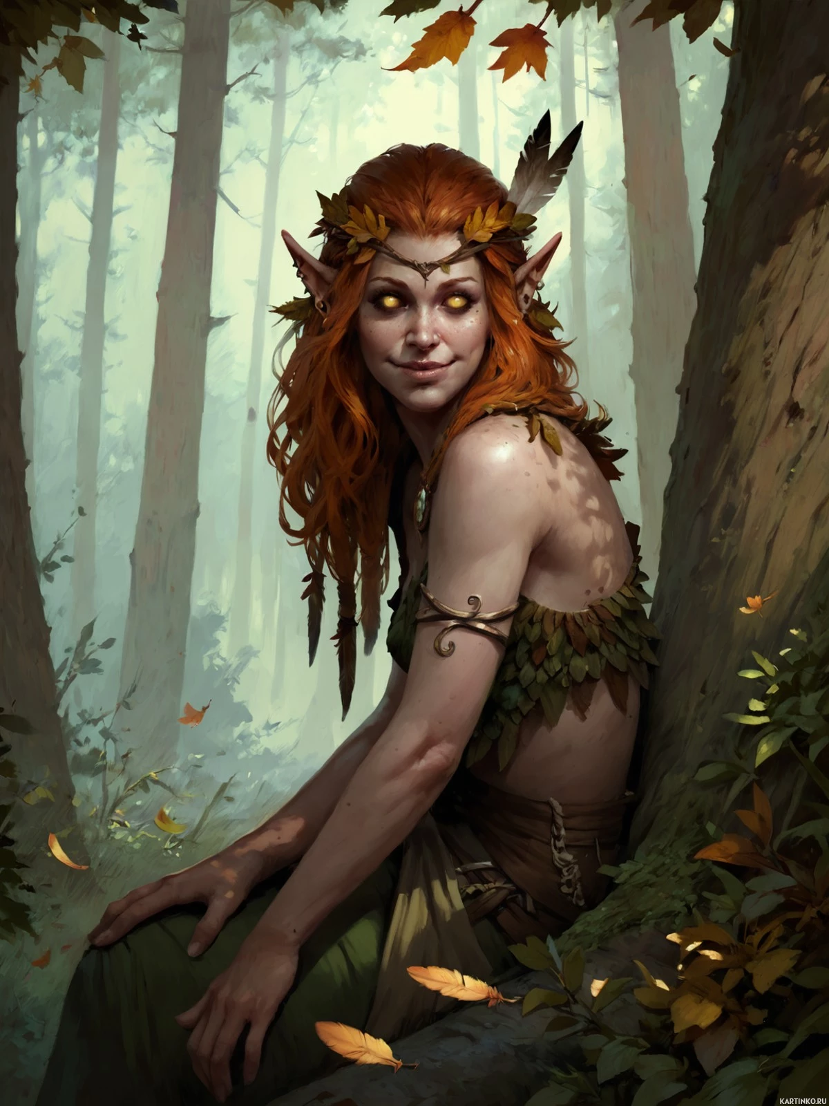 red hair who appears to be an elf. She has pointed ears and is adorned with