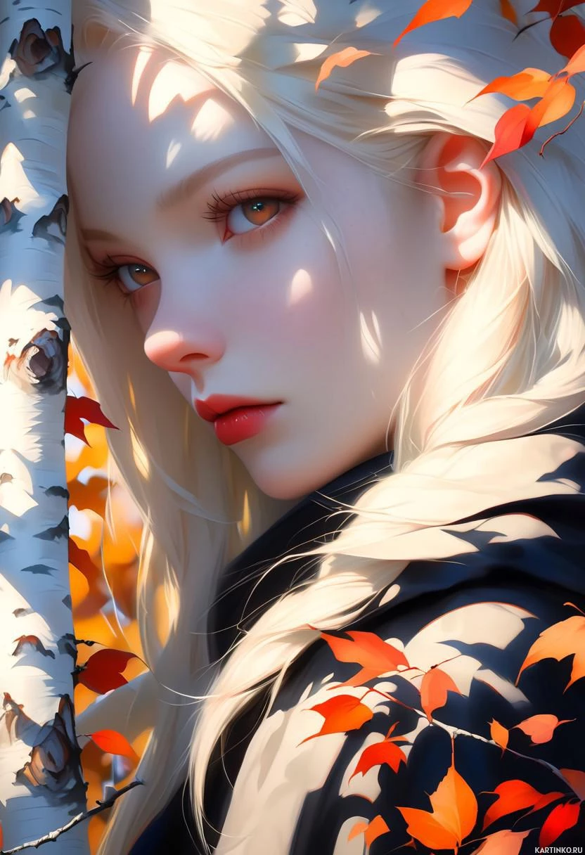 a young woman with white hair, set against an autumnal backdrop. She has