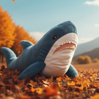 На картинке — игрушечный акула с открытой пастью, лежащий на ковре из осенних листьев в тихом, открытом пространстве. Над ним — чистое небо, что наводит на мысль об утреннем или вечернем времени, когда свет более мягкий. Ветки и листья деревьев окрашены в золотистый цвет, характерный для осенней листвы.