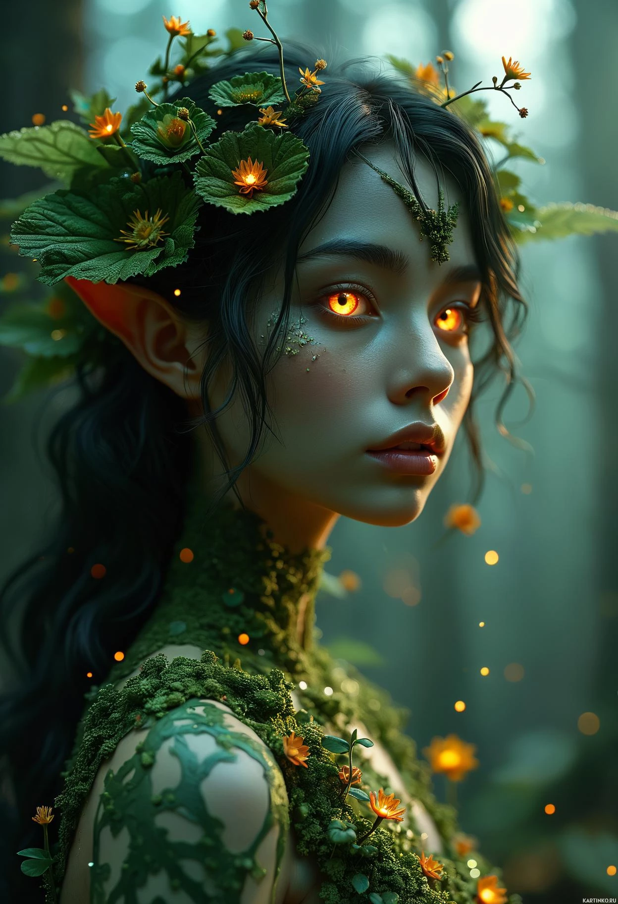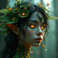 a young woman with brunette hair. She is portrayed as an elf-like character, adorned with various plant elements such as leaves and branches that seem to grow out of her head or are draped over it. Her skin appears fair, and she has striking