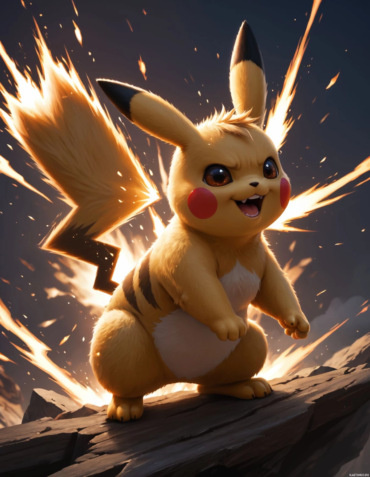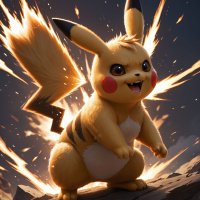 the bright burst of light and smoke around the character. The character has its mouth open as if it is either shouting or reacting strongly to an event. Pikachu is known by its distinctive yellow fur with black markings, large