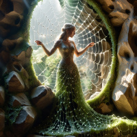 lush greenery with moss and plants growing on it, creating an enchanting atmosphere. Sunlight filters through what appears to be a web of crystal-like structures hanging from above, casting light onto the scene and contributing to