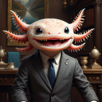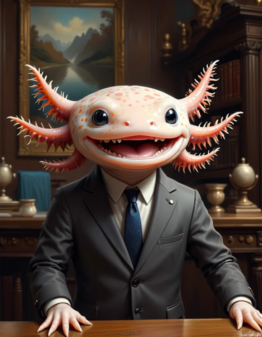 office setting. The creature has the head of a human with a suit and tie, but the body is that of an axolotl, complete with gills on either side of its neck and multiple rows of