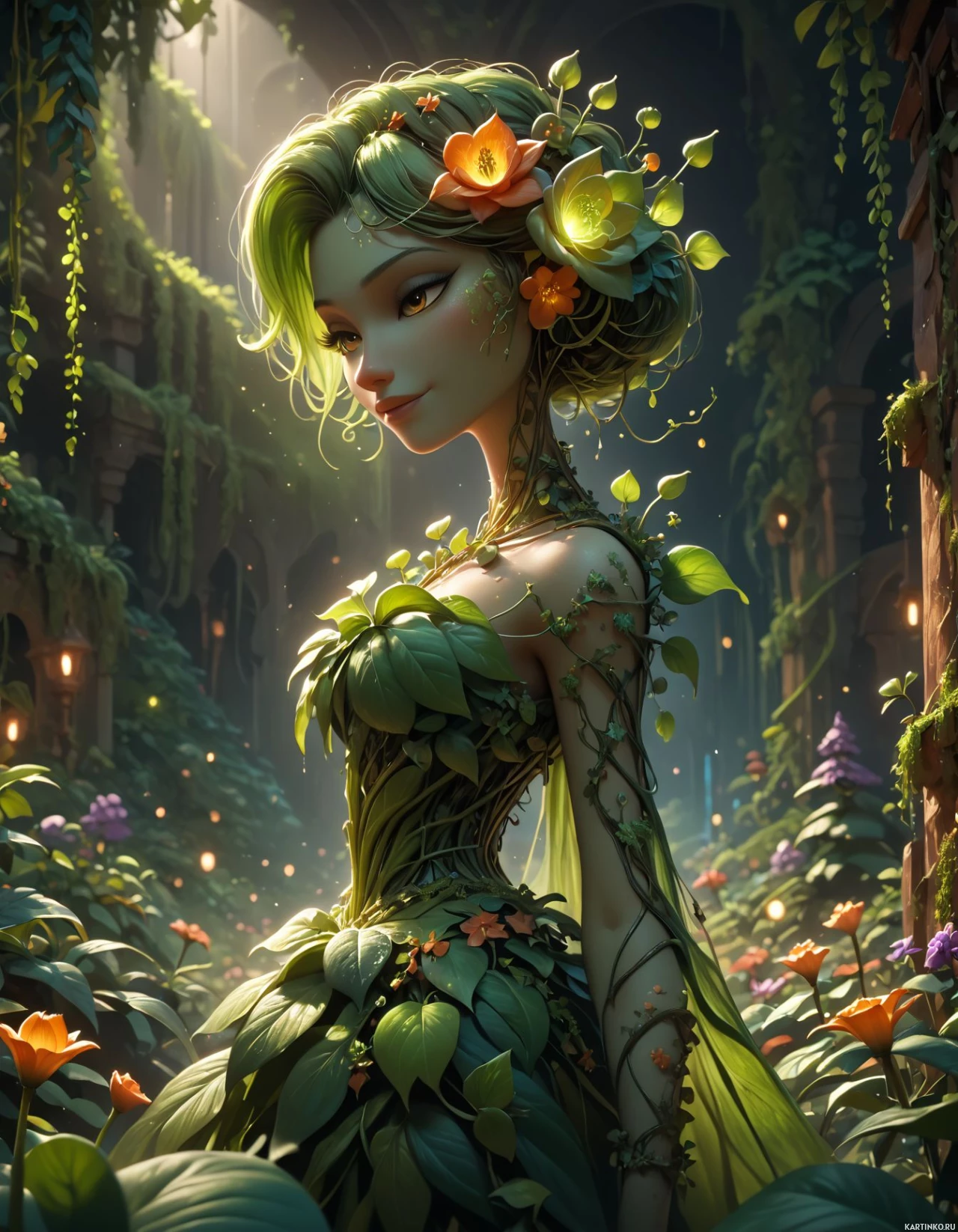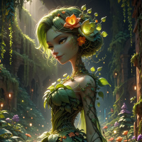 На картинке изображена фигура, похожая на молодую женщину со светлой кожей и длинными волосами, уложенными в высокую причёску, украшенную цветочными или лиственными мотивами. На ней детализированное платье, выполненное в цветочном или растительном стиле, с элементами, напоминающими листья, лепестки и, возможно, стебли или лозы, интегрированные в конструкцию наряда. Преобладающие цвета платья – зелёный, жёлтый и оранжевый, что указывает на вдохновение цветами или листвой. Фон представляет собой пейзаж с арочными проходами, ведущими в, по-видимому, волшебный лес или сад. Земля покрыта яркой растительностью, включая светящиеся растения, что добавляет магии этой сцене. Повсюду расцветают цветы самых разных цветов, усиливая общую неземную и мистическую атмосферу картинки. Стиль рисунка отсылает к фэнтези или сказке, часто встречающемуся в цифровых работах, изображающих персонажей из мифов или историй, происходящих в зачарованных мирах. Уровень детализации платья и окружающей среды указывает на высокую степень мастерства в создании этого цифрового произведения искусства.