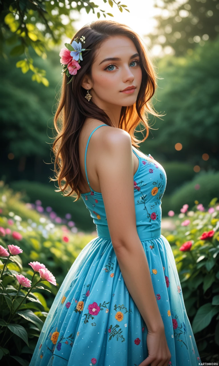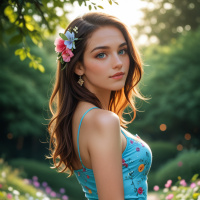 a sleeveless dress with a floral pattern and has flowers adorning her hair, giving off a vintage or bohemian style. Her posture is relaxed with her back turned slightly towards the camera, suggesting she might be looking over her shoulder. The lighting indicates it may be early morning or late afternoon due to