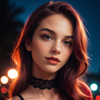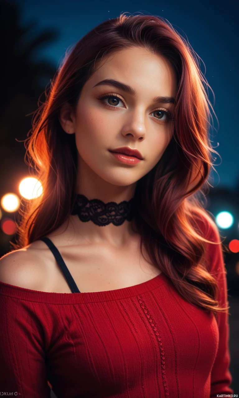 a red top with long sleeves and a ribbed neckline, suggesting it might be cool weather. The background appears to be an urban street at night, with artificial lights visible, giving off