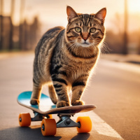 A domestic long-haired tabby cat with a striped coat in various shades of gray, black, and white. The cat's eyes are open and its ears pointed forward, indicating alertness. It is standing on a skateboard with two visible wheels, which appears to be on pavement with sunlight casting long shadows. The scene is likely an urban street setting during the golden hour, as indicated by the warm lighting and soft gradients in the sky.